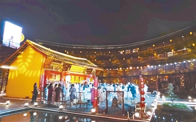 图为《天涯共此楼》沉浸式剧场中真武扮演者出场 为了更好地展现土楼文化内涵,提升游客体验感,近年来,永定区全力推进“夜间文旅提升计划”,以洪坑土楼群、高北土楼群、初溪土楼群为代表的夜间经济发展示范区建设,举办“夜游、夜购、夜品、夜娱、夜习、夜健”等夜间经济特色活动,沉浸式夜游项目建设结合土楼文化背景,以土楼建筑、水系、步道等空间为载体,打造集观赏性、互动性、功能性于一体的感官体验,真正让永定的夜晚“亮”起来,商圈人气“聚”起来,夜间消费“火”起来,群众生活“乐”起来。 |