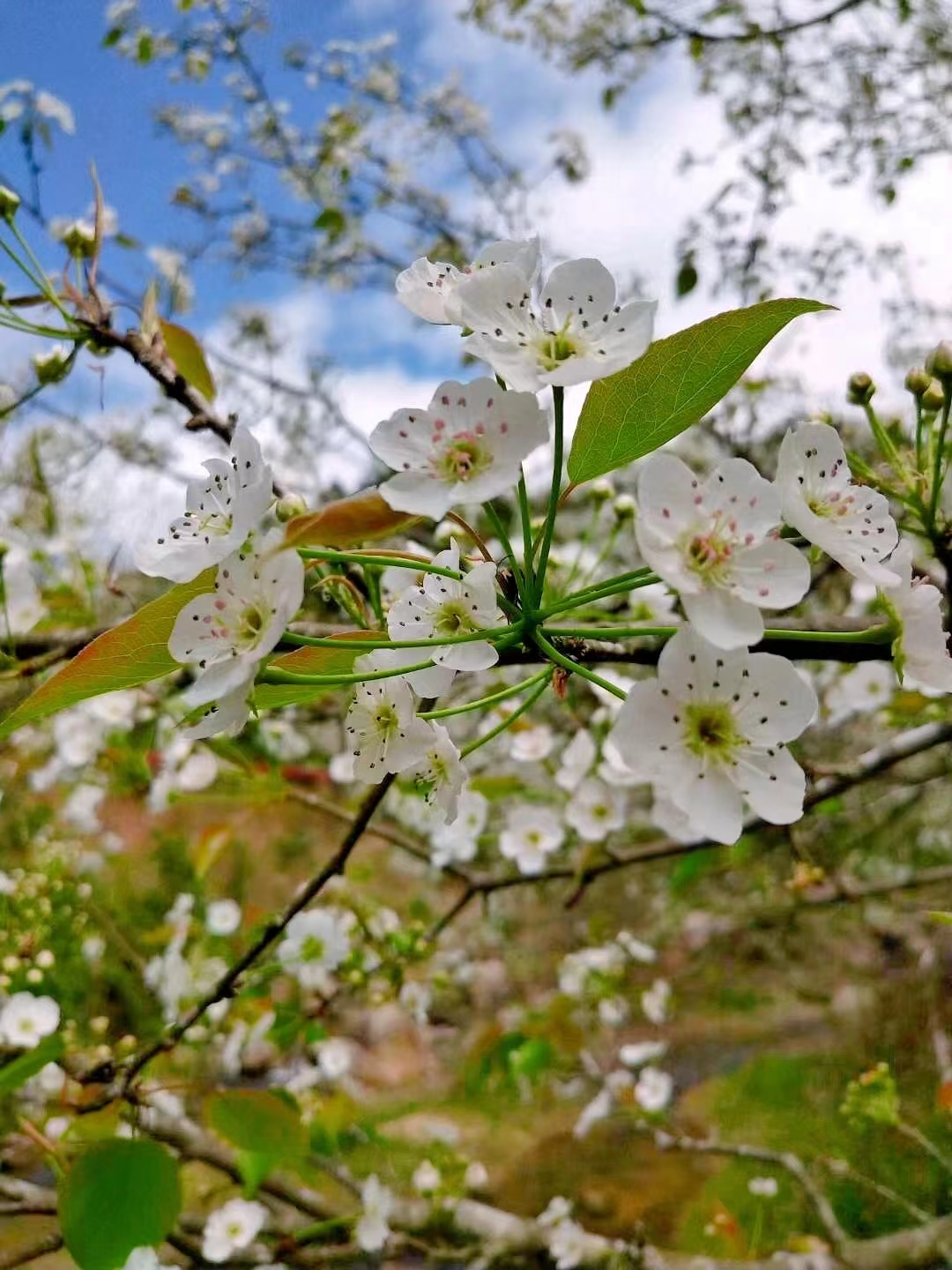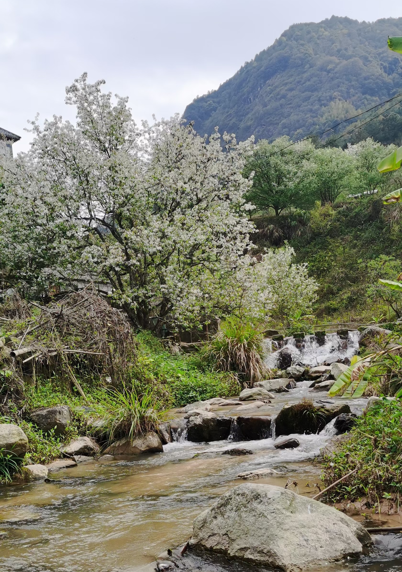 踱步走到密林边,越来越亮,探着光亮走去,一片蓝天下的一个小村庄像揭幕一般开了眼,一座座灰瓦白墙的民居错落有致。循声处,鸡鸣狗吠正浓,见几个老农扛着锄头走在田头,三两个娃在玩着竹马,还有一个酒娘正酿着香气扑鼻的梨子酒。抬头望去,山腰如雪一般白,这应是传说中梨花节的梨花吧。 心有所向,脚步加快向前赶去,路边几棵梨树,星星点点,洁白的梨花,像冰清玉洁少女的头饰,漫步林间小道上,这美丽神话般的“白”就在我的头上、肩旁、指间,“白”得如此通透、坦然、光明,舍不得去触摸,只想俯身深吸,清新满鼻,这不正像人生一样,守住这份“白”是最好的矜持么?此心光明,夫复何求?春风拂来,几片洁白无睱的花朵飘落土中,化作春泥更护花,或与潺潺清水相会,或随风舞了起来,回归大山,还此青绿。