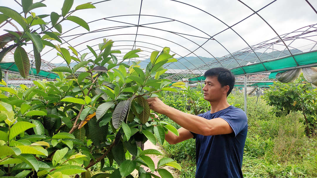 近日,走进龙岩市永定区湖雷镇白岽村60亩的种植基地,大片的番石榴郁郁葱葱长势喜人,枝条上挂满了成熟饱满的芭乐。村民张永淦正忙着给长势良好的西红柿、芭乐进行田间管理。 “现在芭乐长势不错,预计6月可以采摘销售鲜果。我的西红柿也进入采摘期,树葡萄的长势也很不错,接下来,我要建一个集采摘、体验、销售为一体的现代化农业园。”张永淦说。 张永淦2004年退伍,2008年6月从福建师范大学毕业。毕业后,张永淦把目光转向了家乡的红土地。经过多方考察,2010年,他回到家乡,决定流转土地,探索家庭农场经营,开启了起早贪黑的“土地刨金”生活。