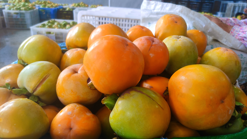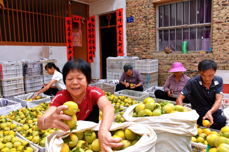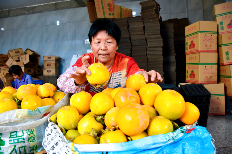 大岭下村的田间地头和道路两旁,金灿灿的柿子将山乡的秋天点缀得格外美丽,柿树枝头挂满酷似“小灯笼”的柿子,一派丰收的景象。村民们穿梭于果树之间,忙着采摘丰收的柿子。江庆容脸上洋溢着灿烂的笑容:“今年我们村的柿子产量有1200万斤左右,销售的价格也不错,是个丰收年。” 记者在柿子收购点看到,果农们陆陆续续载着刚刚采收的柿子前来收购,有的或忙着分拣柿子,有的或忙着装箱装车。收购点负责人江厚明说:“现在的收购价钱是每斤2块左右,我们每天收购1万斤的柿子。现在已经收了15万斤,一般收购到农历9月底结束。”