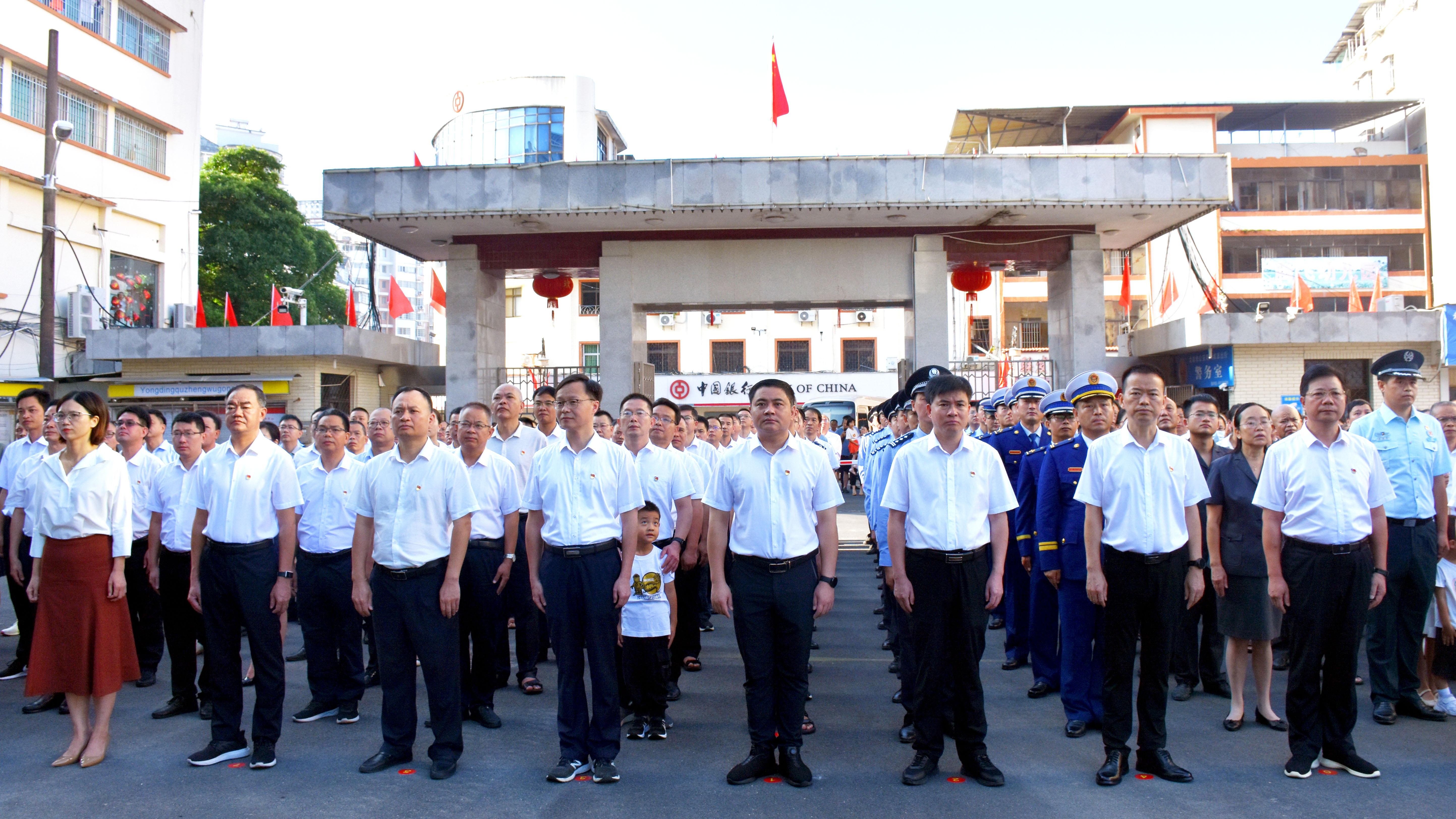 永定区委、区政府大门广场前,鲜花吐蕊、草木葱茏,鲜艳的“中国红”让整个凤城洋溢着节日的喜庆。上午8时整,升旗仪式正式开始。在嘹亮的口号声中,国旗护卫队迈着矫健的步伐,庄严走向旗台。蔚蓝天空下,伴随着雄壮的《义勇军进行曲》,鲜艳的五星红旗冉冉升起。全体人员精神饱满、肃然而立,向五星红旗行注目礼,表达对伟大祖国的无限敬意和深深祝福。当五星红旗缓缓升至旗杆顶端,鲜艳的五星红旗迎风飘扬,广场上的群众纷纷站到旗台,与五星红旗合影,记录下这个珍贵而难忘的时刻。