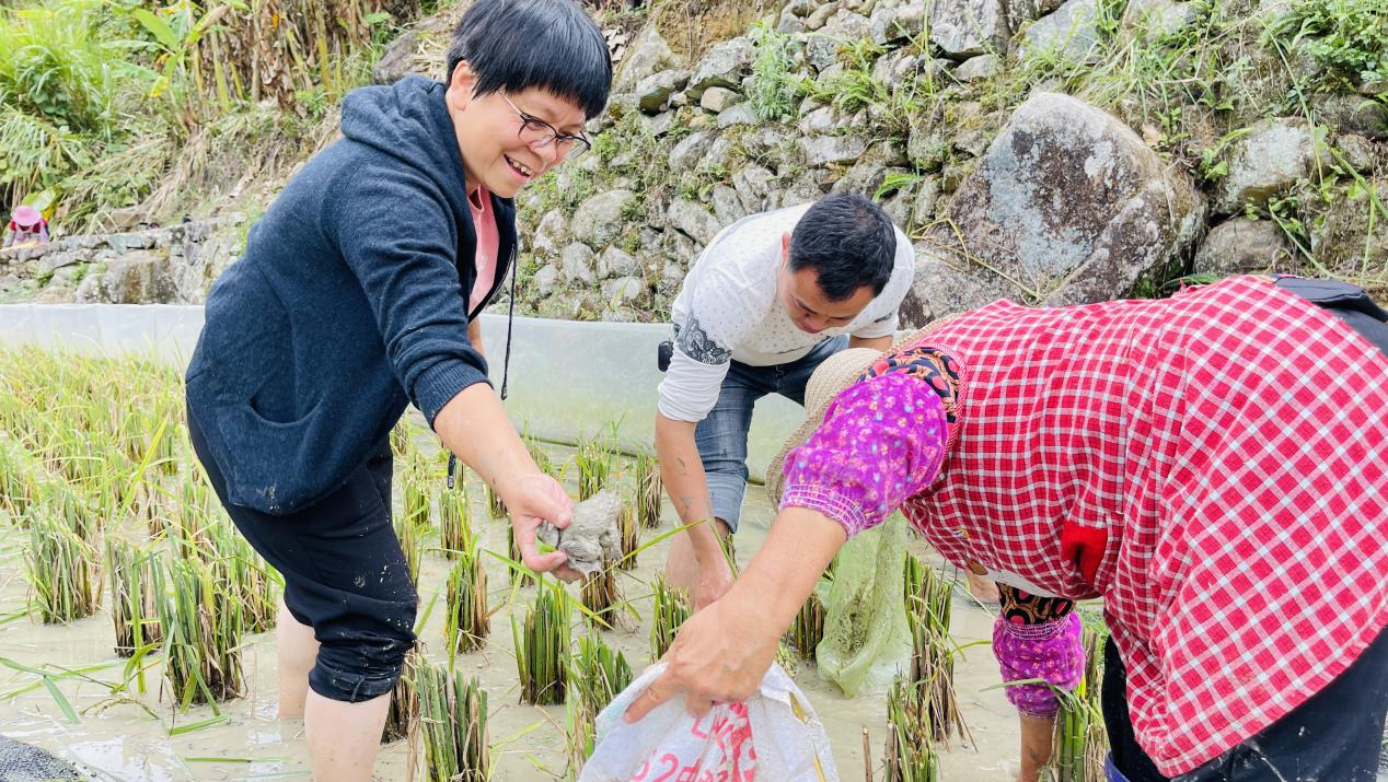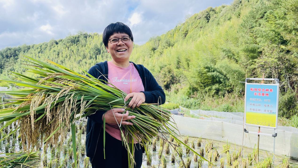 “通过自己测产,大概1亩田可以收割稻谷1400斤,测算陈大米600斤,每斤可以卖15元,产值大概可以达到9000元左右,那虎纹蛙大概有1000斤,能卖到3万元,亩产值总的能够达到4万元左右,今年的稻蛙综合种养大丰收。”正在稻田里的种粮大户陈安娣盘算着今年的收成。 据了解,依托初溪良好的生态环境,永定种粮大户陈安娣先后承包了600多亩的梯田用于种植梯田大米,由于不能机械化耕种,陈安娣的梯田大米经济效益不太明显,为了提高土地综合利用率,今年她专门划出了35亩梯田用于“稻蛙”综合种养,虽然是第一年尝试,但对于种植大户陈安娣来说丰收已成定局,尝到甜头的她有了更大的打算。“用干净的山泉水灌溉,加上现代农业技术赋能,我们不仅稻蛙丰收,而且种出来的大米原生态,不需要任何农药,接下来我们还要扩大种植规模,往旅游观光发展,让稻田种出旅游饭,带动更多的群众致富,牢牢端住自己的饭碗。”永定种粮大户陈安娣自信满满地说。