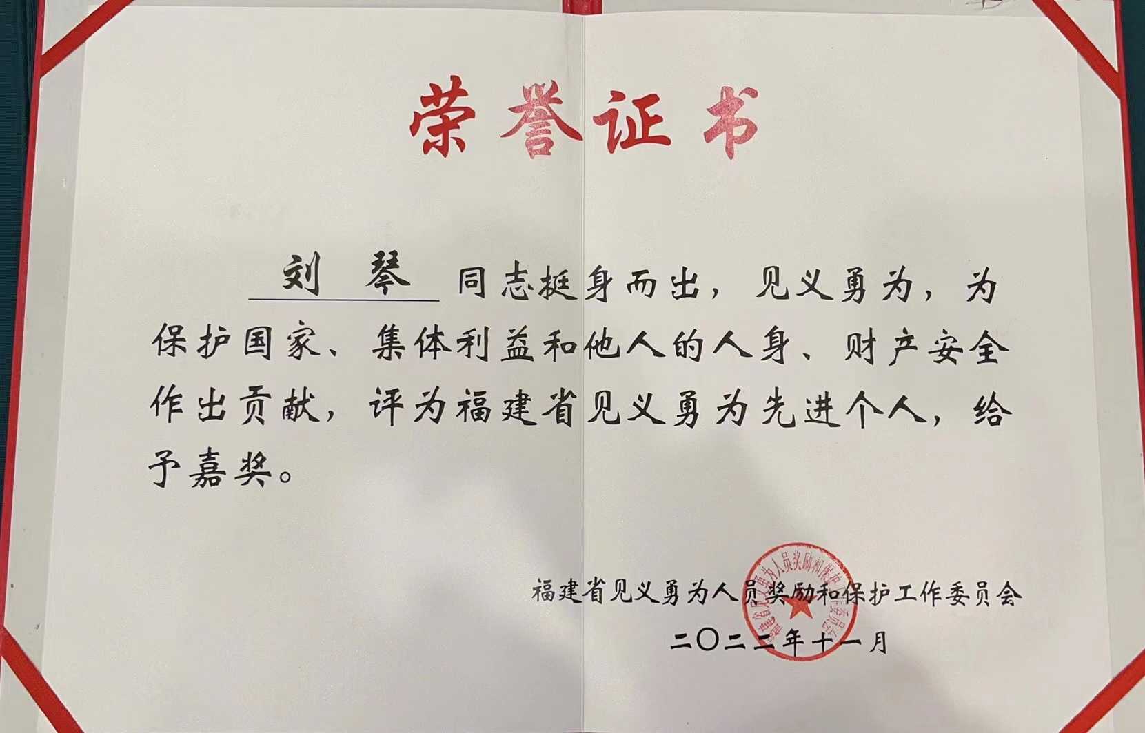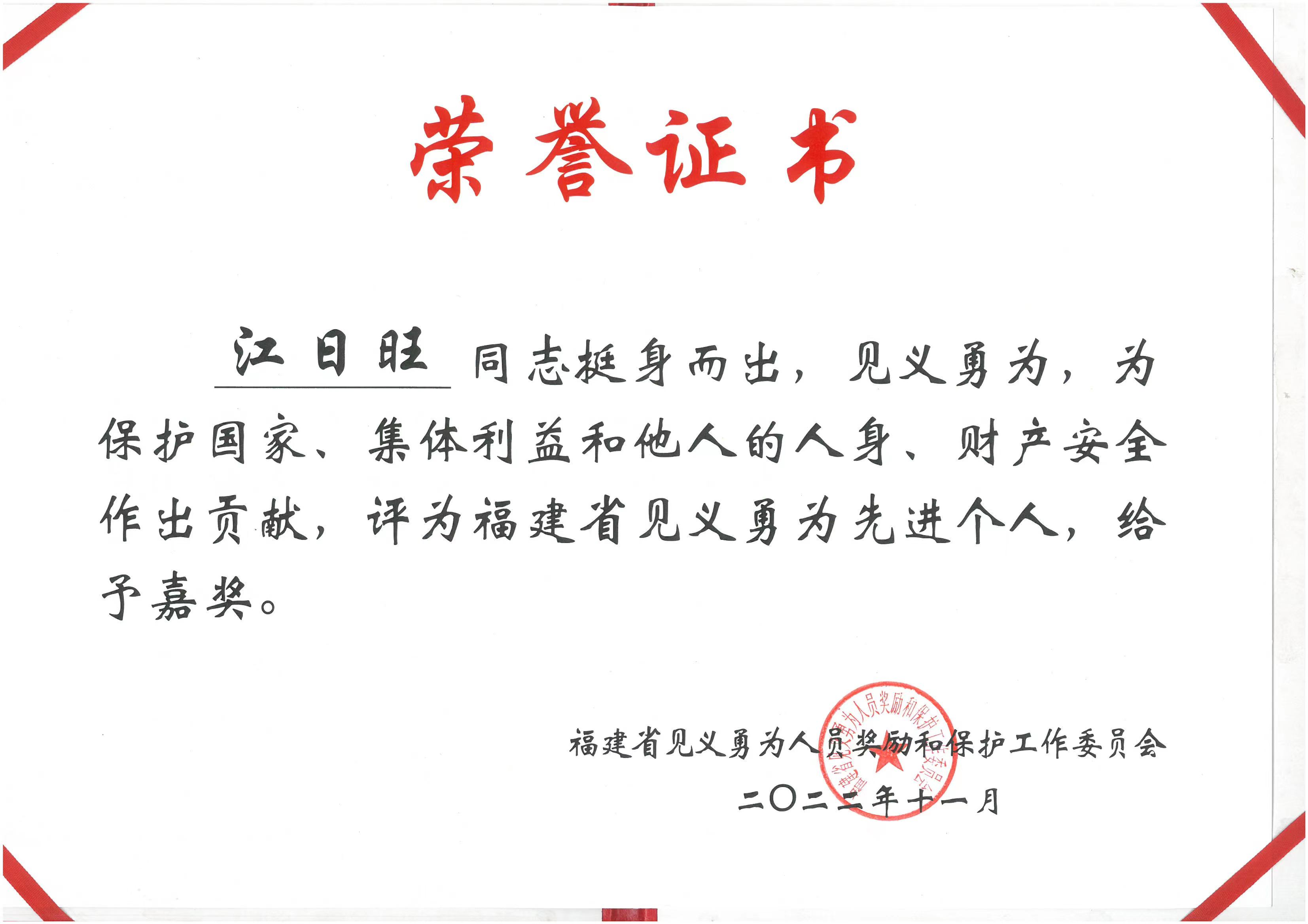 表彰会上,省人民政府授予郭朝明等10人“福建省见义勇为模范”荣誉称号;省见义勇为人员奖励和保护工作委员会授予陈美等25人“见义勇为先进个人(群体)”荣誉称号;省妇联授予吴英治等4人“福建省三八红旗手”荣誉称号。 其中,共产党员、永定区税务局工作人员刘琴,共产党员、永定区凤城街道东兴社区监委会主任江日旺,被福建省见义勇为人员奖励和保护工作委员会授予“见义勇为先进个人”荣誉称号,分别获颁荣誉证书、奖章和8万元奖金。同时,刘琴被省妇联授予“福建省三八红旗手”荣誉称号,获颁荣誉证书、奖章和2千元奖金。
