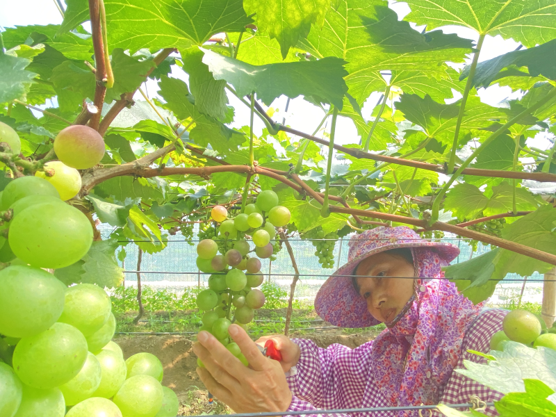 视频加载中... 永定新闻网讯(张榕华)5月30日,在虎岗镇虎西村铭远蔬菜种植场葡萄大棚里,一串串葡萄挂满了架。趁着晴好天气,区人大代表王七娘忙着为葡萄疏果、摘心,经细致梳理后,一串串葡萄像是紫色水晶,形状、大小十分匀称。 王七娘是地地道道的农民,虽然文化水平不高,但确有一颗带领群众共同富裕的心。扎根乡土几十年,她奔忙于田间地头,不断钻研种植技术。在她丈夫赖钦良的支持下,夫妻俩成立了龙岩市永定区良友果蔬种植专业合作社,带领当地村民走上特色产业发展的道路。