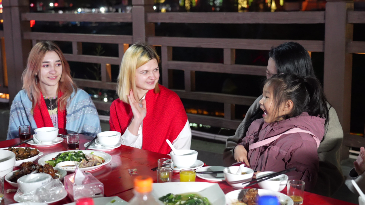 “在神奇神秘的土楼吃汤圆,看烟花,看表演非常的兴奋,很有新鲜感,我一定要发朋友圈。”来自厦门大学的俄罗斯留学生安妮和同学卡琳娜一起来土楼过元宵,卡琳娜是第一次过中国的元宵节,她说“在这里很多人一起吃糍粑,它和汤圆一样,都是甜甜的,很新鲜。”