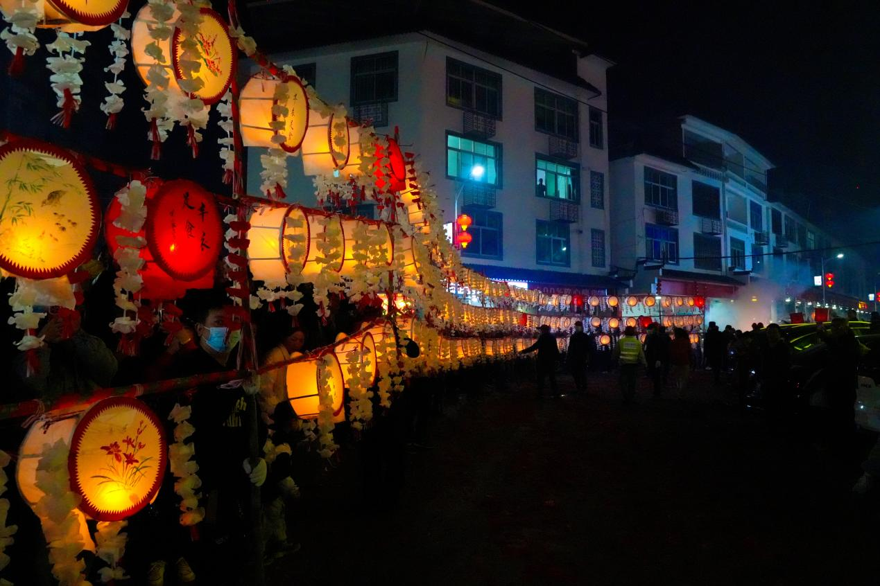 夜色中,迎灯队伍逶迤前行,由1000多名村民组成了1000多米长的“竹篙灯”,一架架花灯就如一条条火龙游动,浩浩荡荡穿行于下洋集镇的大街小巷,舞龙和舞狮更是增添了节日的喜庆气氛,金龙起舞,狮子翻跃,带动当地及周边的群众和游客一同欢庆元宵佳节。