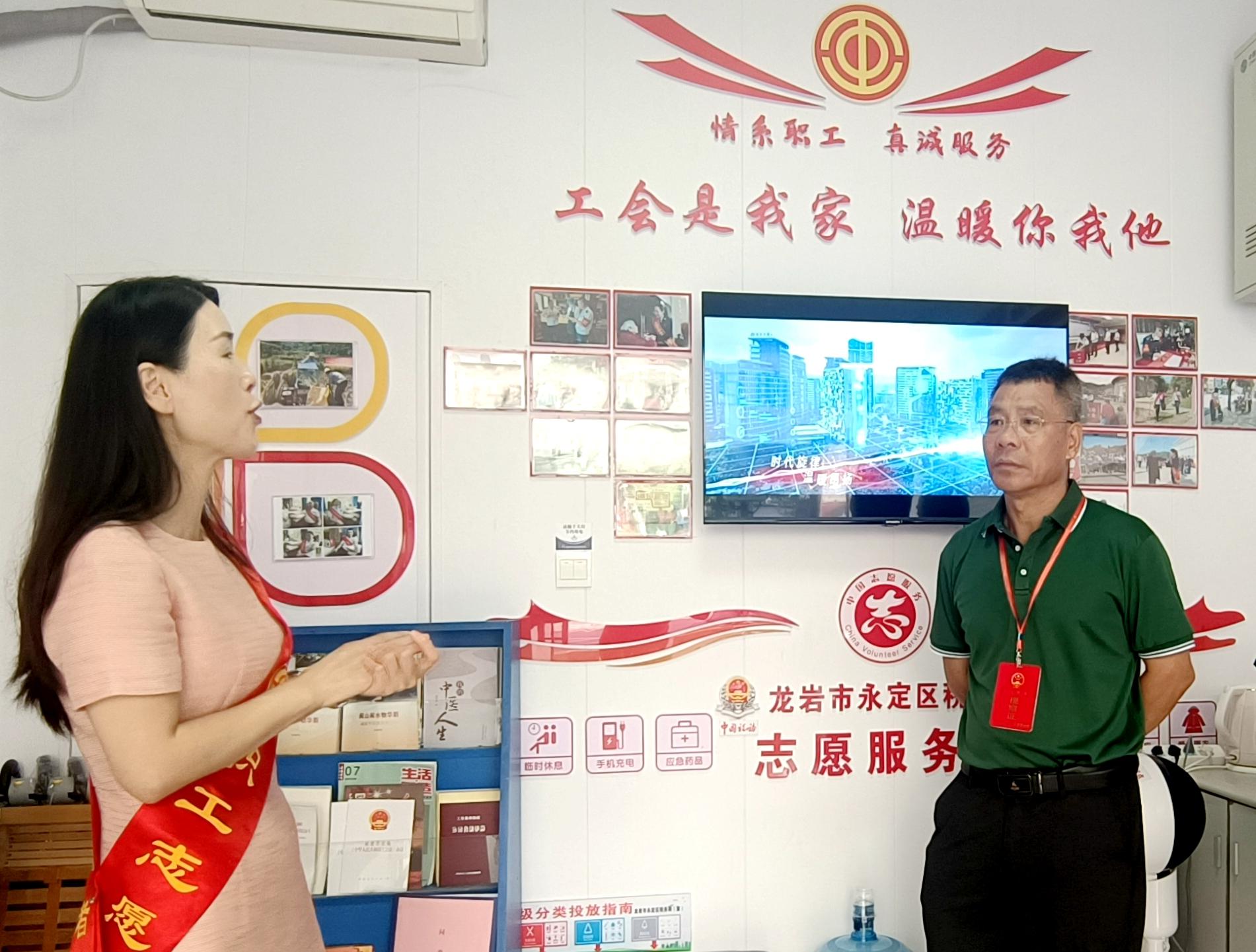 ▲ 龙岩市人大代表、永定区总工会兼职副主席、区劳模协会会长刘永良(右)走访了解永定区工会驿站的建设运营情况,并建言献策。 “‘习近平总书记指出:我们要围绕发展全过程人民民主,坚持好、完善好、运行好人民代表大会制度,为实现新时代新征程党和人民的奋斗目标提供坚实制度保障。’”龙岩市人大代表、永定区总工会兼职副主席、区劳模协会会长刘永良说:“今年6月底,我虽然退休了,但我仍然是人大代表、还是工会工作者,我将把人大代表工作和工会工作结合起来,努力探索‘人大代表+工会’工作模式,为践行全过程人民民主注入新内涵;以‘人大代表+工会’力量,赋能产业高质量发展,全心全意为人民群众做好事、办实事、解难事,当好新时代人民群众的‘代言人’、职工的‘娘家人’。