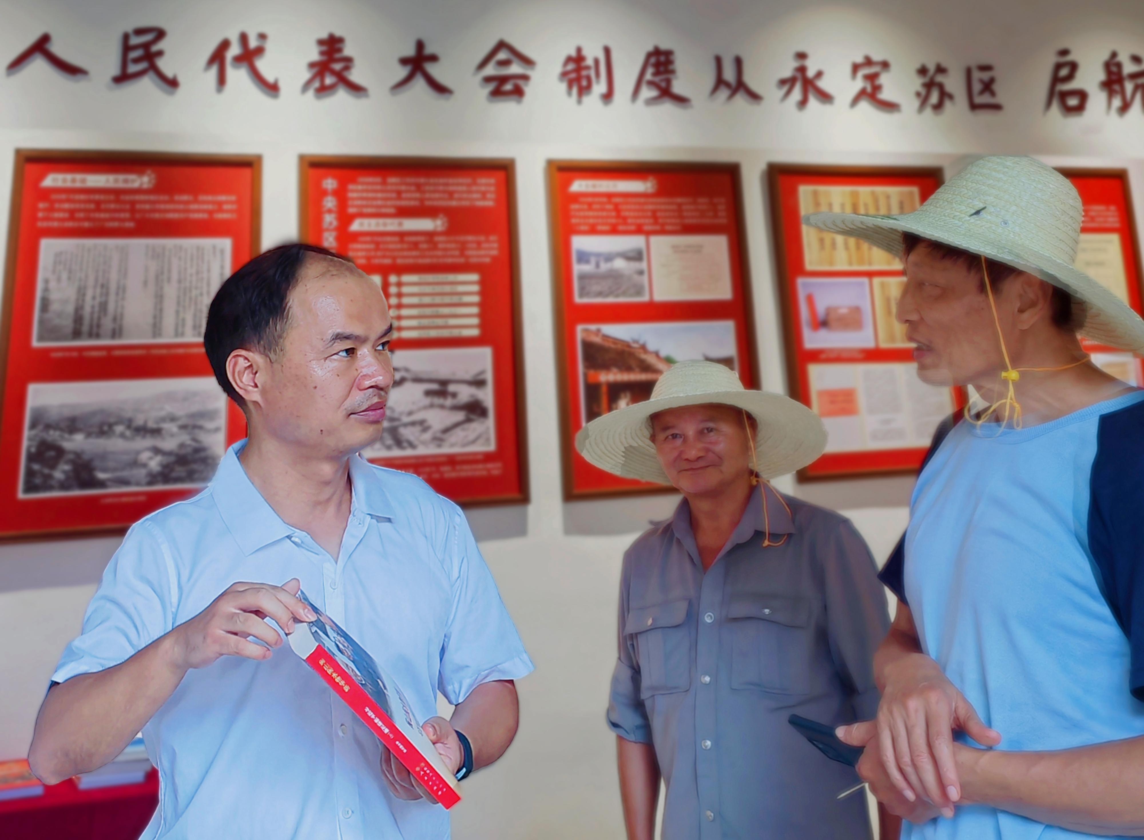 ▲ 永定区人大代表、金砂镇人大主席团主席林如建(右)在“人民代表大会制度从永定苏区启航”展陈室向参观者讲解红色故事。 永定区人大代表、金砂镇人大主席团主席林如建表示:“基层民主是全过程人民民主的重要体现。1928年8月,溪南区工农兵代表大会在永定金砂召开,成立了福建省第一个区苏维埃政权,通过溪南区《土地法》,开创了中国共产党领导下民主建政、法治建设的先河。我们将深学细悟习近平总书记在庆祝全国人民代表大会成立70周年大会上的重要讲话精神,进一步传承弘扬党领导人民创建苏维埃代表大会制度的实践探索经验,笃行实干、守正创新,不断丰富全过程人民民主实践,为经济社会发展和民主法治建设贡献人大力量。” |