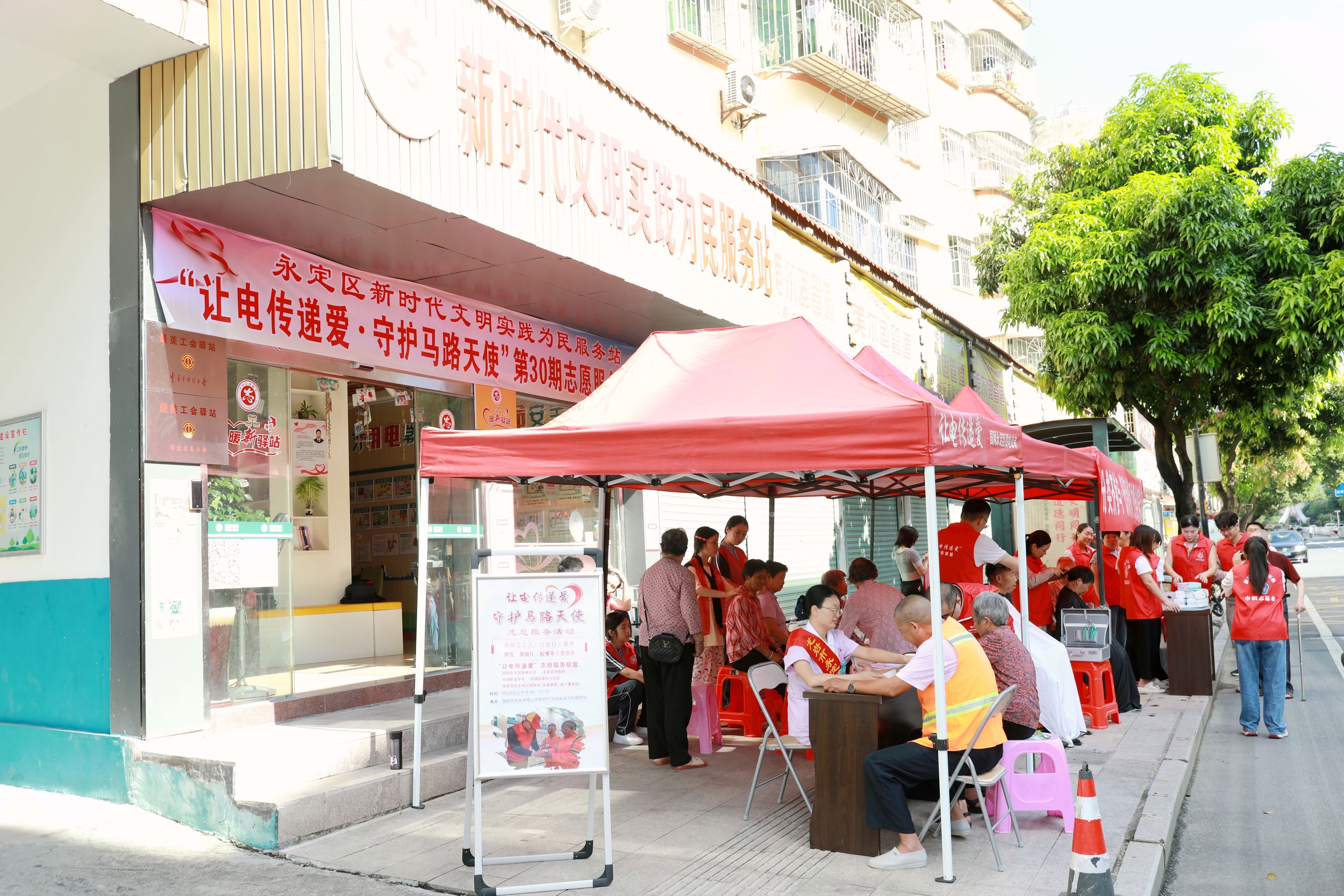 9月26日,国网永定区供电公司携手永定区中医院、明德职业中专、凤城街道东兴社区、永定区红土地公益协会,在东大道新时代文明实践为民服务站开展“让电传递爱·守护马路天使”第30期志愿服务活动,免费为环卫工人、过往行人提供理发、血压测量、按摩等志愿服务。