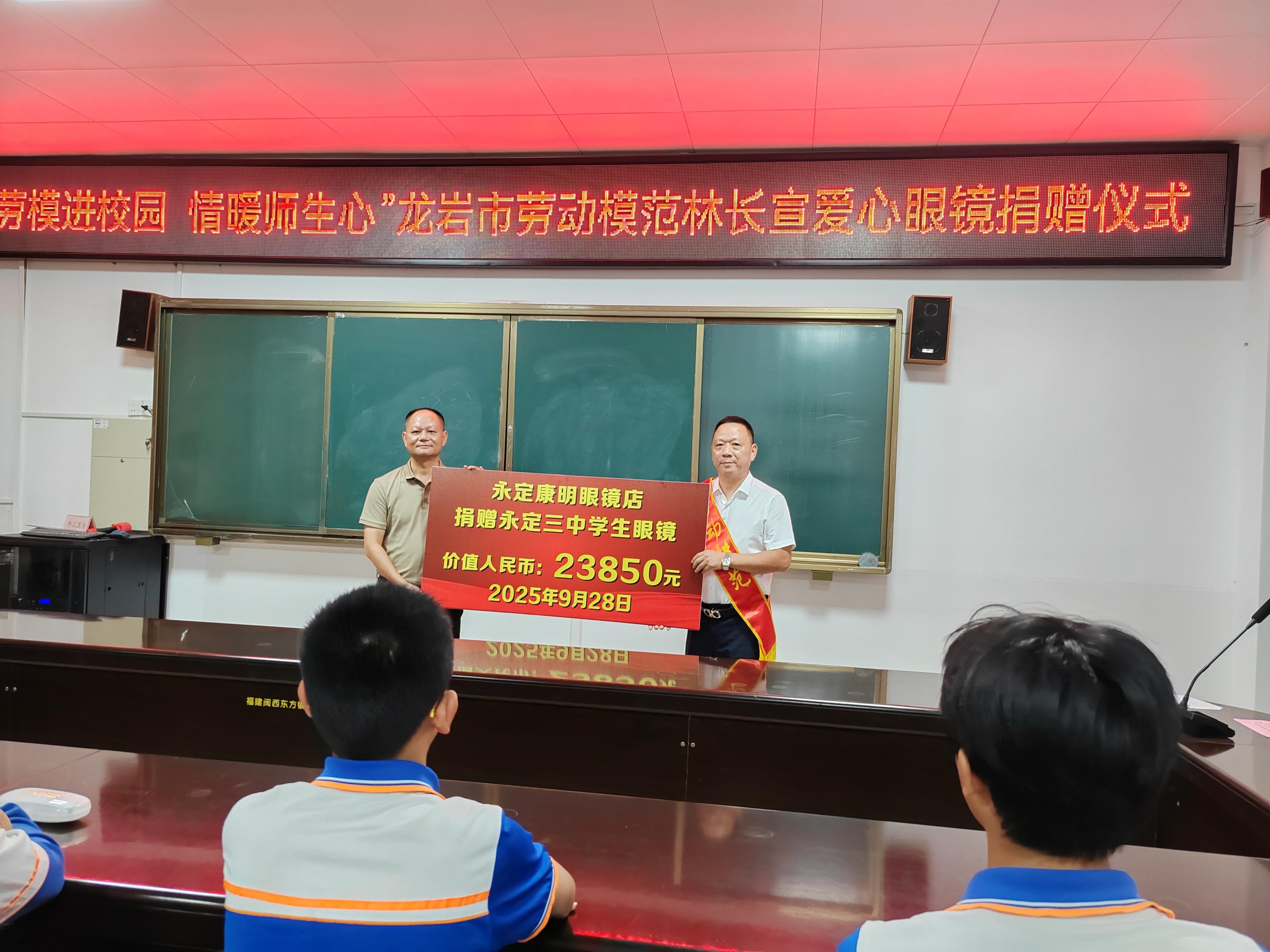 视频加载中... 上午获评劳动模范,下午进校园献爱心,这不仅仅是一个时间表,更是一个荣誉与责任、获得与奉献的赞歌。9月28日下午,刚从龙岩载誉归来的市劳动模范林长宣走进永定三中开展“劳模进校园 情暖师生心”捐赠眼镜活动。一位受赠学生发自肺腑地说:“一副副精美的眼镜,不仅给我们带来了眼前清晰的世界,也给我们以后的人生指明了努力的方向。”