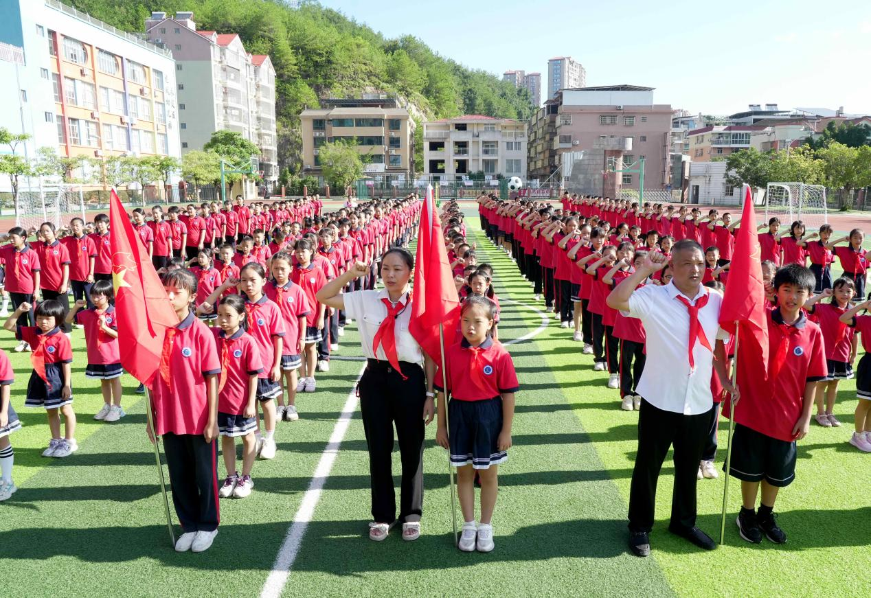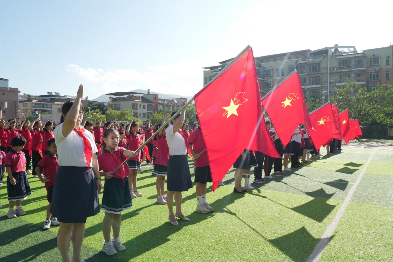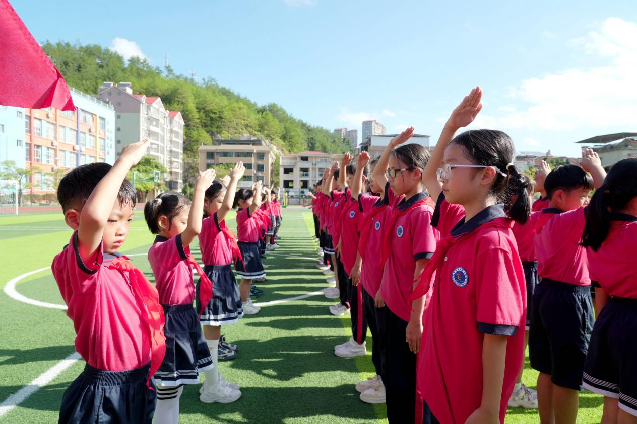 在庄严的《出旗曲》中,旗手步伐铿锵,护送队旗入场,全体少先队员凝神肃立,目光追随着鲜艳的队旗,郑重敬起队礼;《中国少年先锋队队歌》响彻校园,同学们用嘹亮歌声传递前进信念,稚嫩嗓音里满是少年朝气。校领导、辅导员与老队员们手持红领巾,郑重为新队员佩戴——当红色三角巾在胸前展开、系紧,荣誉与责任的种子也随之扎根,新队员眼中闪烁的自豪光芒,成为现场最动人的风景。随后,新队员们在大队辅导员的带领下高举右拳,面对队旗庄严宣誓,“爱党、爱国、爱人民”的誓言虽轻,却字字铿锵,深深烙印在每颗少年心中。