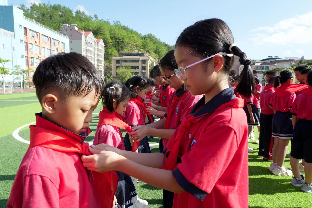 “红领巾是红旗的一角,是革命先辈用鲜血染成的。我们要珍惜这份荣誉,用实际行动为红领巾增光添彩!”新队员刘语欣说。 “当红领巾戴上脖子的那一刻,我特别骄傲!以后我一定好好读书,主动帮同学,用实际行动让这条红领巾一直鲜艳。”新队员吴国瀚说道。