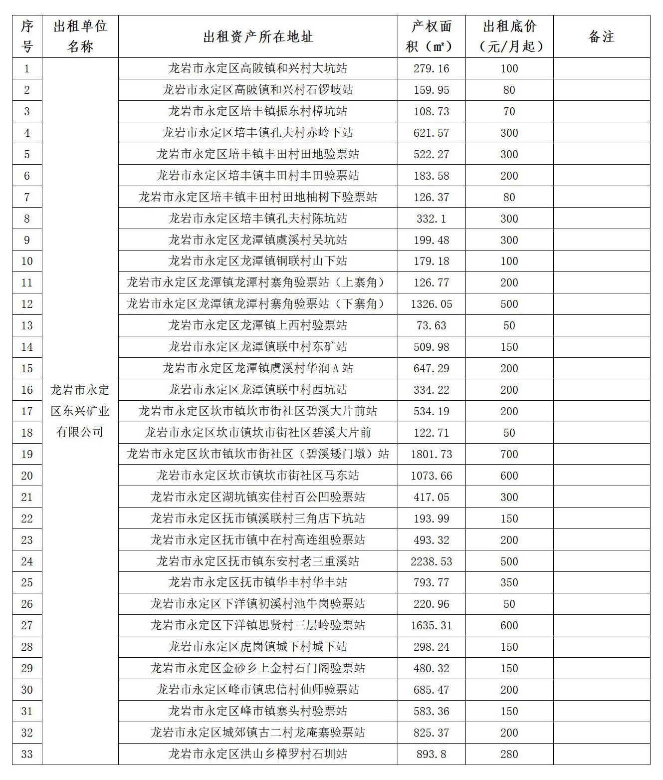 二、报名时间 1.集中报名时间:2025年10月13日至10月24日。 2.资产未出租前,出租公告长期有效。 三、出租期限:2年。 四、承租条件 承租人需整体租赁,须遵守国家法律法规,遵守社会公德,且能诚信经营,具有独立法人资格的企业、其它组织和具有独立承担民事责任的自然人均可参加。 五、出租价格、履约保证金及支付方式 1.出租价格:鉴于33处站点多数地处偏远区域,按参照原矿管总站对外出租价格或站点所在村镇的价格(均不含物业费、水电费等),2025年10月13日至10月24日集中报名期间多人欲承租的按出租价格“价高者得”的原则执行,之后拟租赁的按报名顺序先到先得的原则执行。 2.履约保证金:承租人需交纳履约保证金人民币1000元,承租到期7个工作日不再续租且无违约责任的将无息退还保证金。 3.租金支付方式:租金每半年支付一次,租赁起始日以合同签订日期为准。在合同签订日期起7个工作日内,承租人须将半年租金及履约保证金汇至龙岩市永定区东兴矿业有限公司兴业银行永定支行账户(173010100100054487)。 六、其他相关要求 1.承租人报名时,属企业或组织的须提供营业执照复印件,属自然人的须提供身份证复印件,两者还须填写承租用途、联系人和联系方式。 2.承租人独立承担承租活动中产生的债权、债务,独立承担工商、物价、税收等方面产生的所有费用与责任。 3.承租人不得从事任何违法经营活动。 4.承租人要爱惜出租方提供的服务设施(包括门、窗、玻璃、墙壁等),不得擅自改变房屋的结构及用途,装修方案需取得出租人的认可后方能实施,一切费用自理。 5.承租人独立承担消防、安全等安全职责,如发生意外,租赁人承担所有责任。 6.租赁期间如遇东兴矿业公司因工作需要收回标的的,承租人应无条件服从,合同自行终止,未到期部分预交租金则如数无息退还,出租方不承担任何赔偿费用。 7.承租人未经出租人书面同意不得私自将该标的转租他人。 8.承租意向人需自行前往现场踏勘。 七、报名地点及联系人 1.龙岩市永定区凤城街道九一路58号4楼,联系人:李先生,联系电话:13859561160。 2.龙岩市永定龙潭镇联中村,联系人:张先生,联系电话:13459760409。 附件: 1. 附件1:33处资产现状图.docx 2. 附件2:意向承租报名表.docx