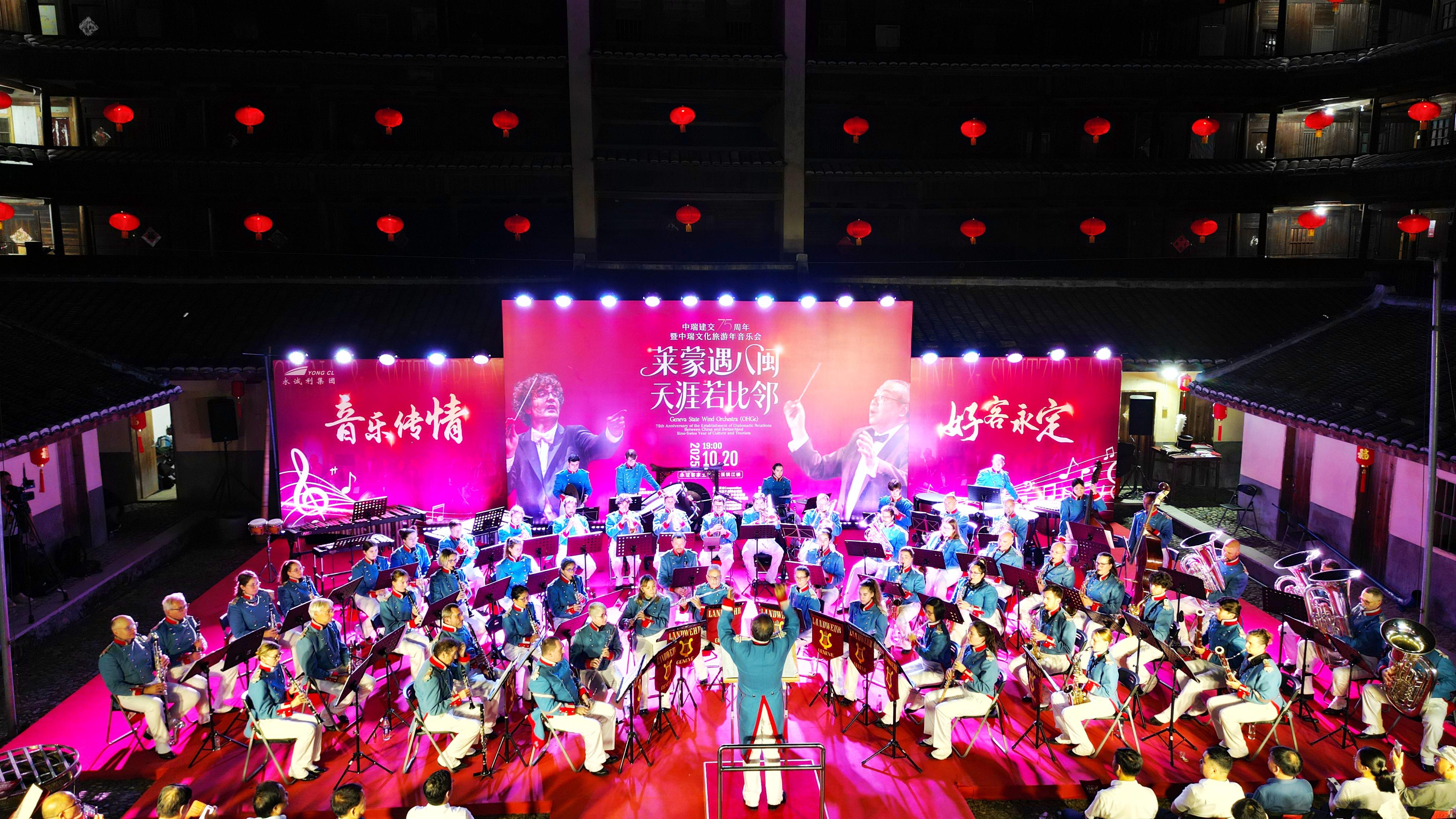 10月20日晚,福建省永定区大溪乡的镇江楼内灯火通明,一场以“土楼为幕、音符为桥”为主题的交响音乐会在此隆重上演。来自瑞士日内瓦州立管乐团的70余名音乐家,以中西合璧的演奏献礼中瑞建交75周年暨中瑞文化和旅游年,为现场观众带来一场跨越8000公里的艺术盛宴。 音乐会在《欢迎进行曲》中拉开帷幕,由瑞中文化艺术交流协会会长、指挥家赵元与瑞士指挥家让-克里斯托夫·莫尼耶联袂执棒。随后,中瑞两国国歌的旋律在土楼穹顶下庄严奏响,观众自发起立合唱,掌声雷动。乐团还演绎了《红旗颂》《鼓浪屿之波》等中外经典曲目,既有恢宏的革命叙事,亦有婉转的地域情怀,展现出音乐跨越国界的感染力。