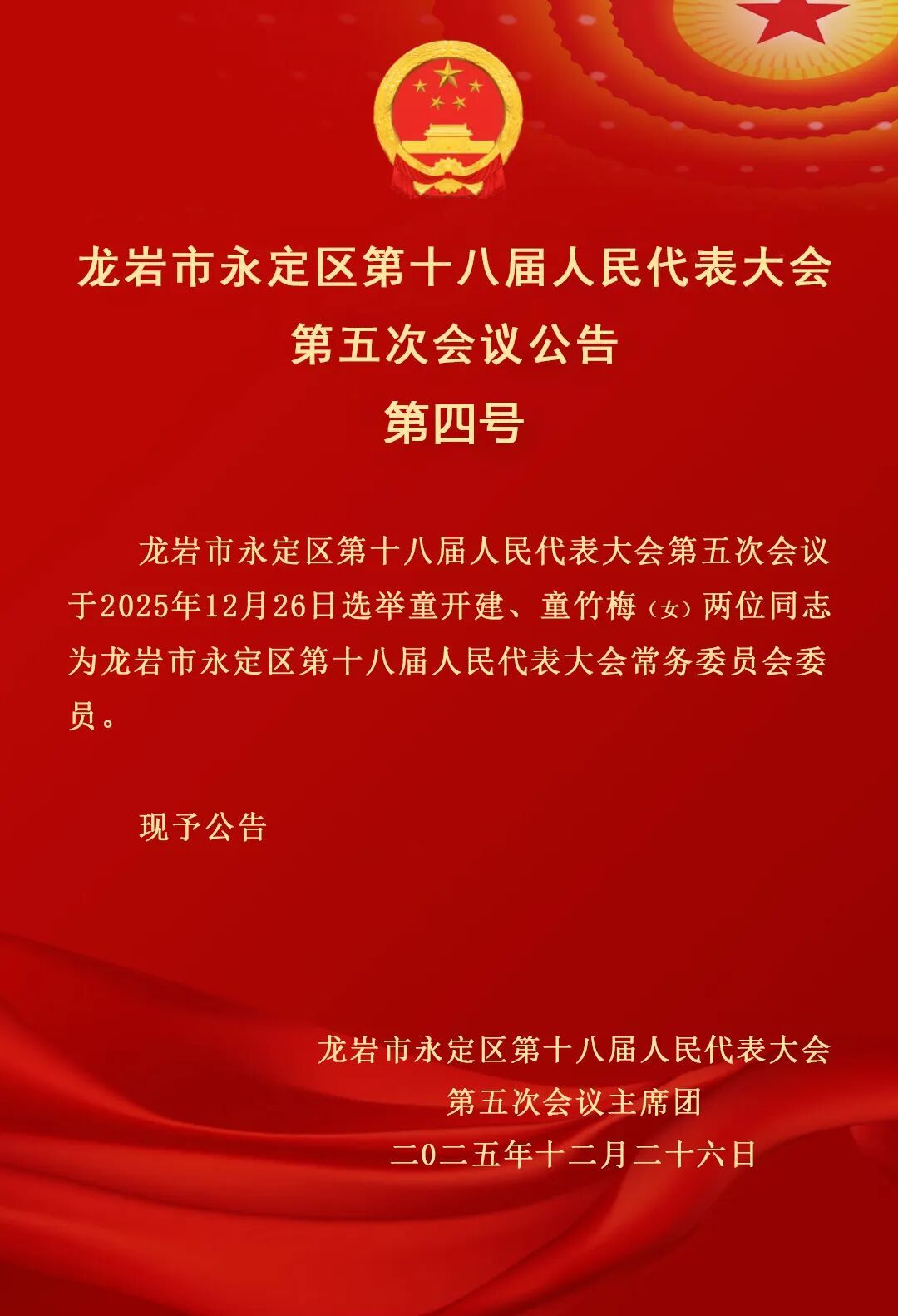 龙岩市永定区第十八届人民代表大会第五次会议公告(第四号)