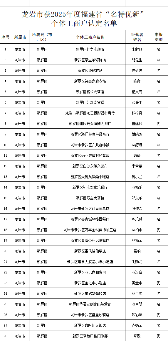 2025年,福建省认定1040家“名特优新”个体工商户,其中龙岩市永定区:老水大排档(名)、阿敦大排档(名)、黄海花牛肉店(新)、和古纯粮酒厂(名)、昌喆黄酒作坊(名)、燕记小吃(特)、空下潭家庭农场(新)、新凤凰酒店(特)、思边椒酱厂(名)、春万家小吃店(特)、富才家庭农场(新)、新君来食品厂(名)、富裕家庭农场(新)、好运饼家(名)等14家个体工商户上榜。