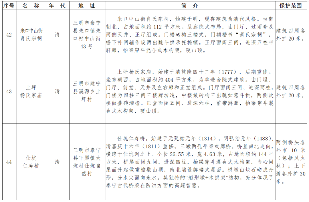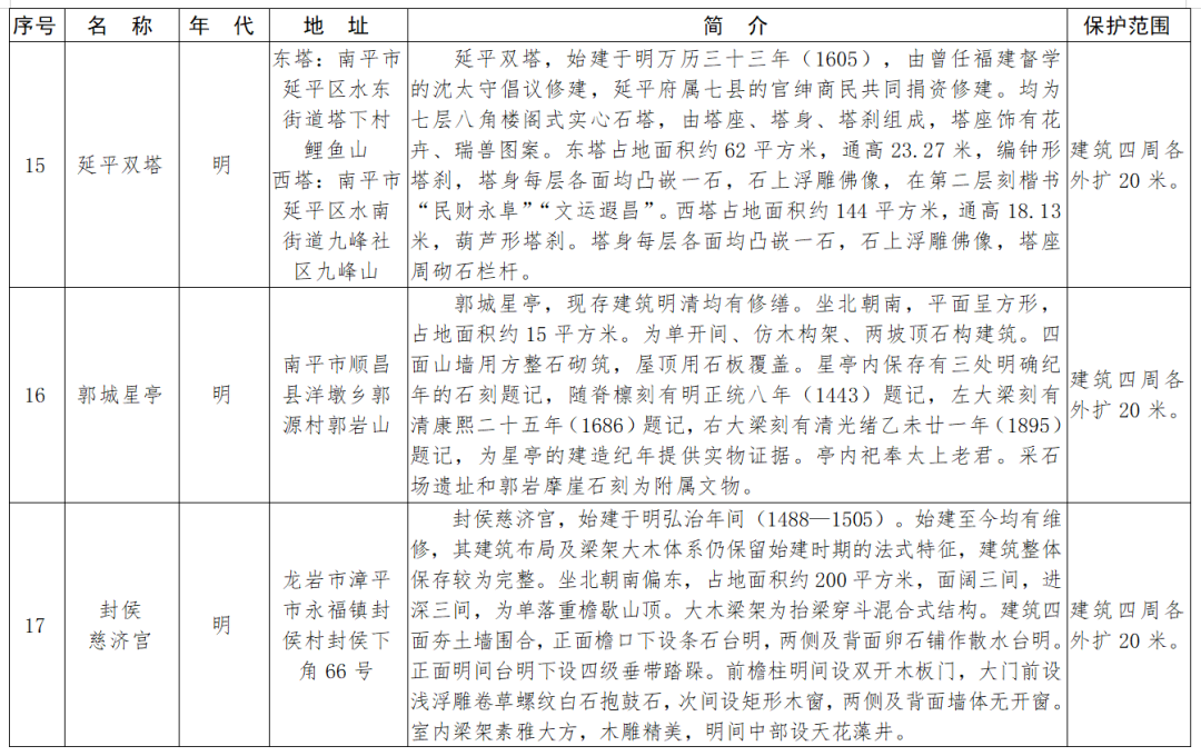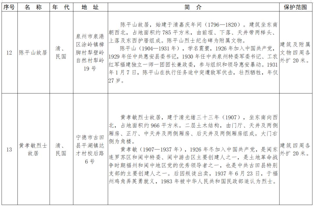 视频加载中... 近日,福建省人民政府公布了第十一批省级文物保护单位名单及保护范围,133处(含2处扩展项目)榜上有名,其中包括永定区的5处文物。 据悉,此次公布的“省保”单位涵盖古遗址6处、古墓葬8处、古建筑63处、古石刻及造像8处、近代重要史迹及代表性建筑45处、其它1处、扩展项目2处。其中,永定区湖坑镇奥杳村“庆福楼”被列入古建筑类;永定区湖坑镇奥杳村“奥杳乡苏维埃政府旧址‘裕德楼’”、永定区虎岗镇虎西村“毛泽东旧居‘晏田祠’”、永定区湖坑镇奥杳村“奥杳战地旧址‘裕兴楼’”、永定区洪山镇尚径村“廖成美将军祖居尚径‘承荫楼’”等4处被列入近代重要史迹及代表性建筑。 福建省第十一批省级文物保护单位名单及保护范围 一、古遗址(6处)