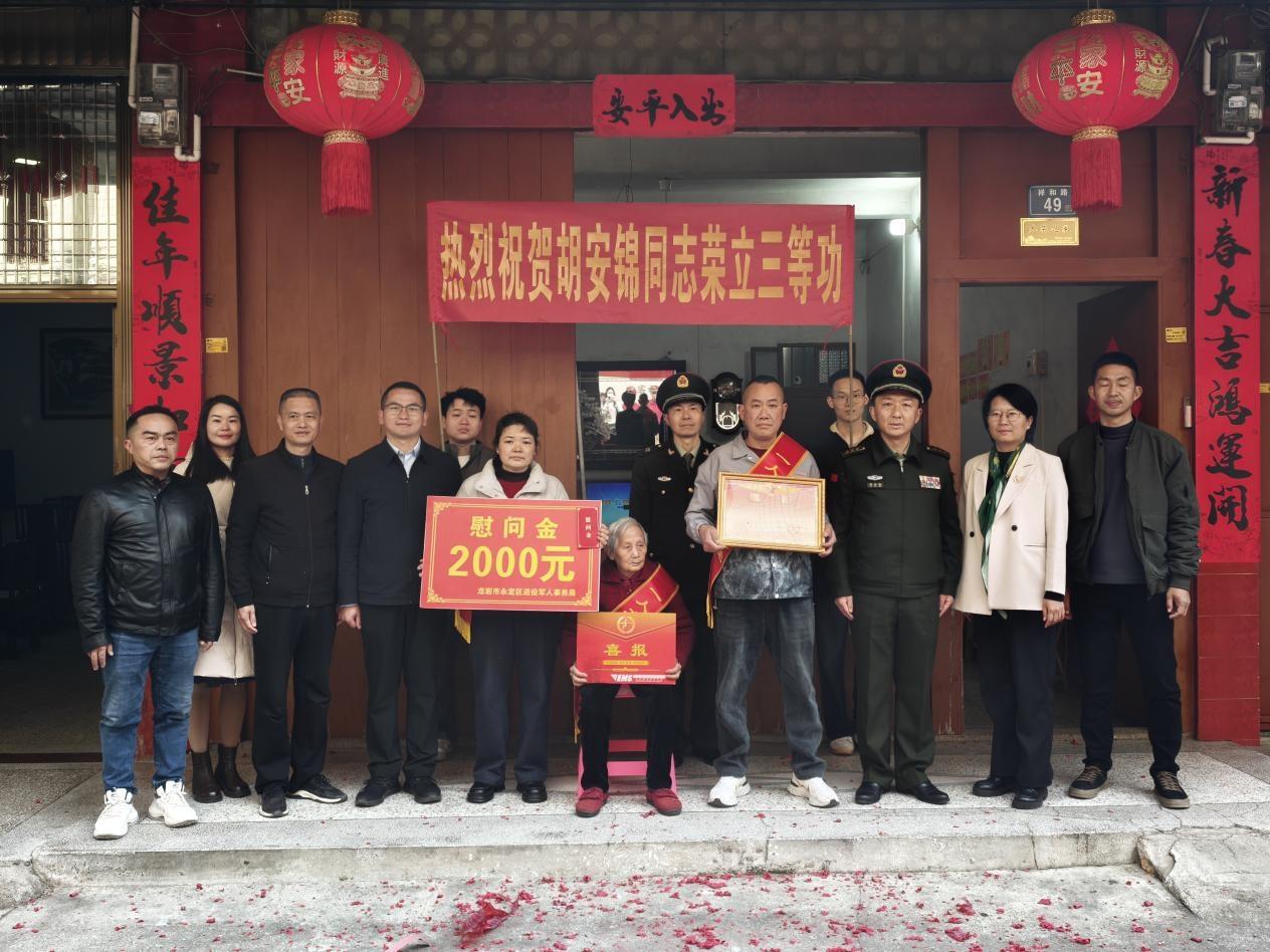 1月14日上午,由区人武部、退役军人事务局及下洋镇领导干部组成的送喜报队伍将喜报、奖章及奖金送到胡安锦家中,并向其家属致以祝贺与敬意。