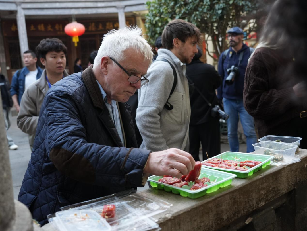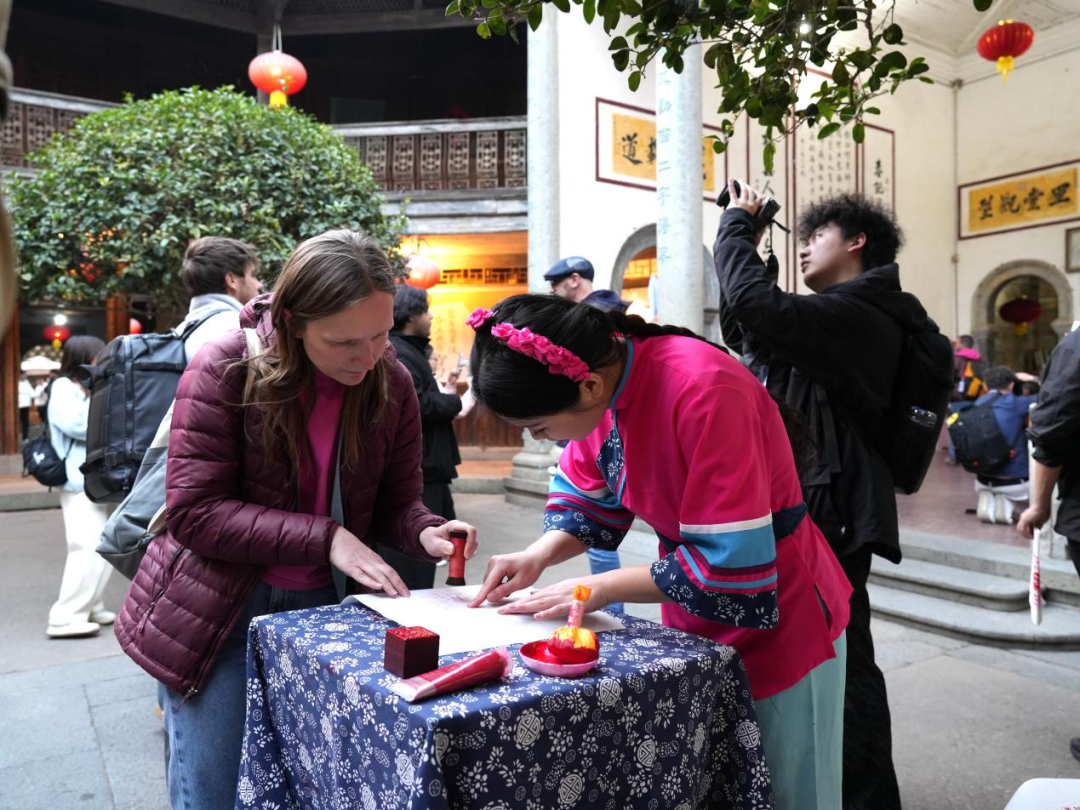 活动现场,网红大V还亲身体验了客家小吃打糍粑、镬笃粄的制作过程,在烟火气中感受客家饮食文化。品尝美食的间隙,网红大V们观赏拓“福”与客家蓝衫非遗展示,近距离触摸客家文化的鲜活脉络;德国网红Sindy在老师的悉心指导下,学习并尝试了木偶泡茶的技艺,这一生动有趣的互动场面吸引了不少欧洲网红大V驻足拍摄。
