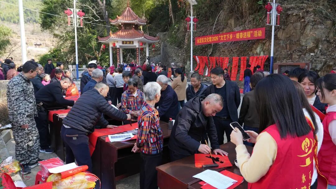现场,临时舞台上十番音乐、客家山歌、革命红歌等兼具本土特色与新春气息的精彩节目赢得村民阵阵掌声。舞台一侧的送春联区域,纸墨飘香,书法家们现场挥毫,书写新春祝福,一幅幅作品寄托着对乡村振兴与美好生活的祝愿。