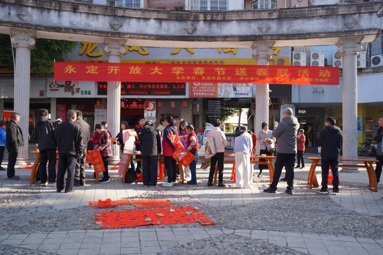 活动现场翰墨飘香、年味浓郁,来自客家书画院的五位书法爱好者现场挥毫泼墨,楷、行、隶等多种字体神韵兼备。一幅幅寓意美好的春联、一张张喜庆的福字,承载着新春祝愿,受到了群众欢迎。 “手写春联更有年味,现场既能感受传统文化魅力,又能领到专属祝福,心里十分温暖。”市民张庆明表示希望此类活动常办常新。 “寒假能参与这样的活动很有意义,既能锻炼书写能力,也能用自己的笔墨为大家送上新春祝福。”学习书法四年,已经第二次参加活动初一学生张馨瑜说,看到居民们拿到春联时的笑脸,就觉得特别开心、特别有成就感。 永定开放大学表示,将继续立足本土、服务群众,持续开展形式多样的文化惠民活动,以文化力量赋能基层治理与社区文明建设,让传统文化在基层落地生根。
