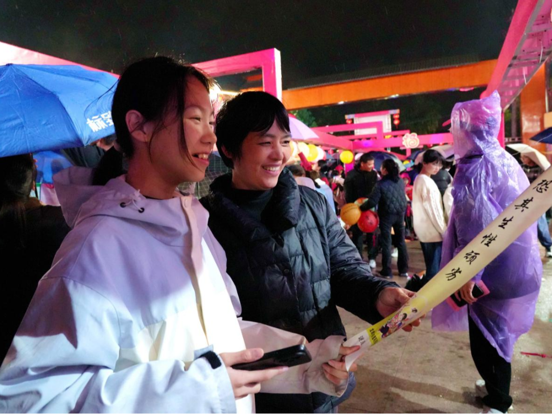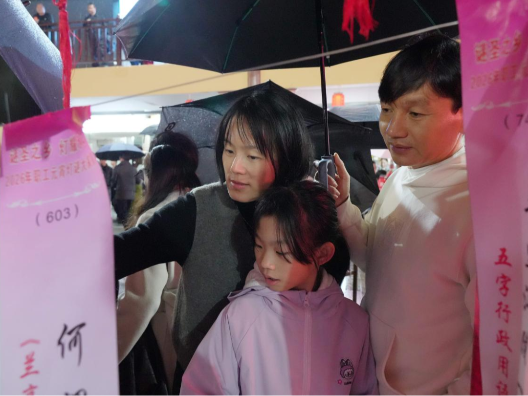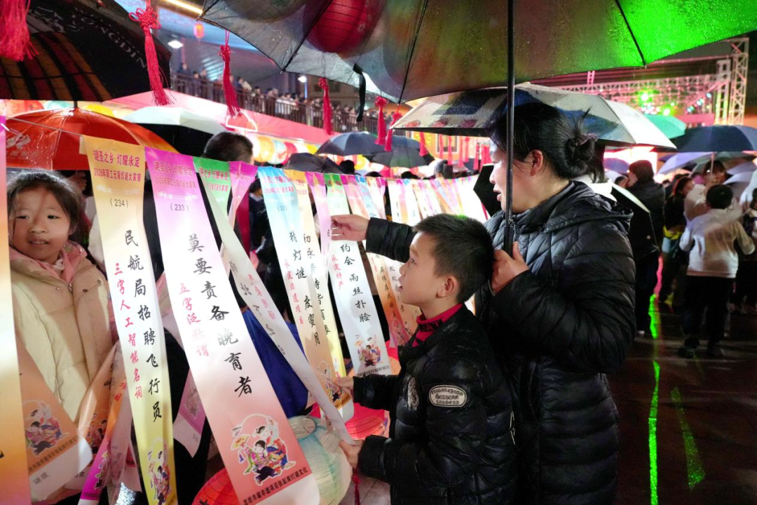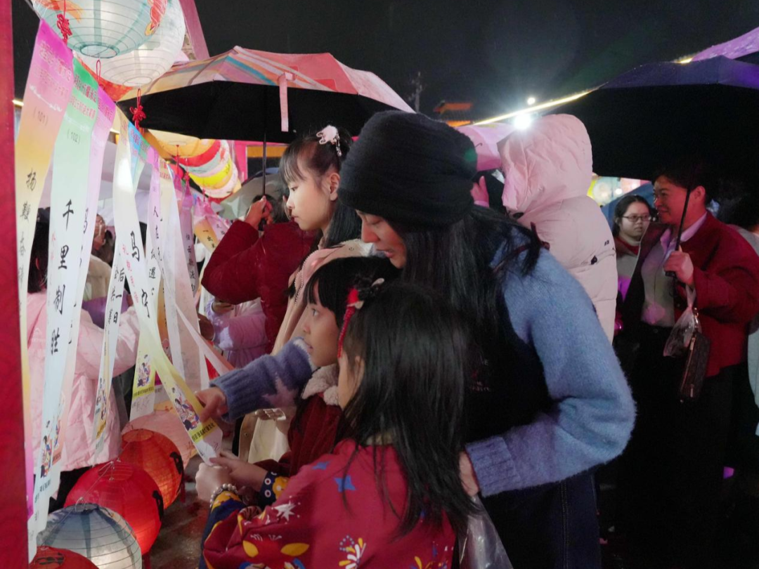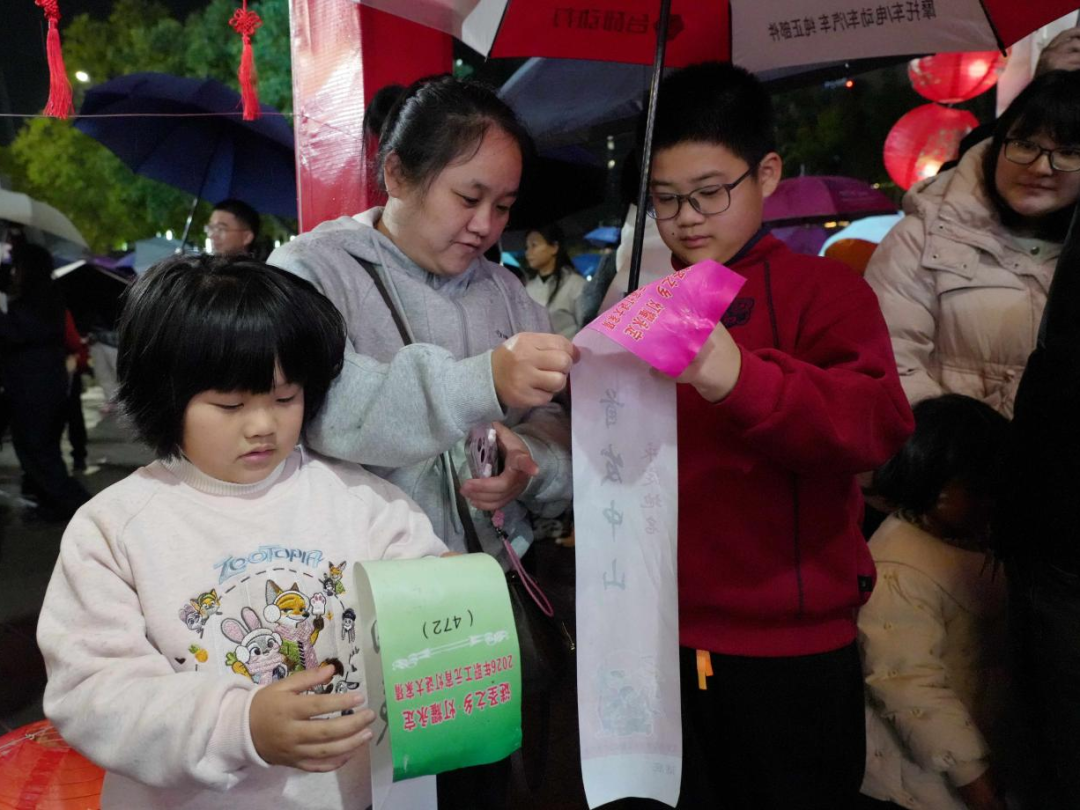夜幕降临,夜市华灯璀璨。市民游客携家带口,撑着雨伞在灯海谜阵中穿梭。现场谜题难易兼顾、老少皆宜,既有传统诗词、历史典故,也融入本地文旅、乡村振兴等创新元素。大家或驻足沉思,或轻声探讨,细雨中的欢声笑语交织成温馨乐章。猜中谜底的市民欣喜兑奖,脸上洋溢节日喜悦。