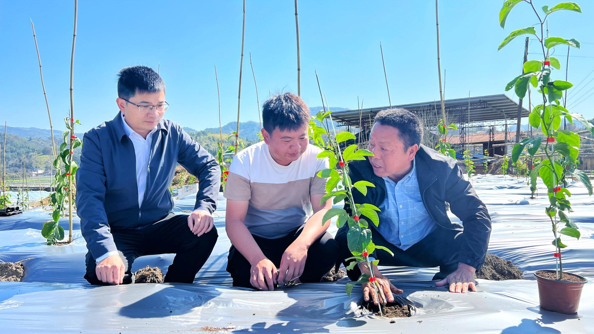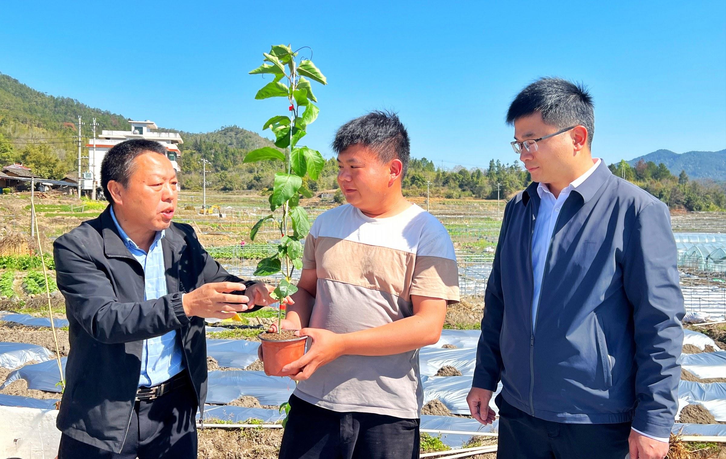 “百香果下地以后,浇水一定要浇透,把根养好来……”3月12日,在古竹乡陂子角村的田间地头,30岁的苏子涵正听得仔细。这位去年刚从厦门返乡的“新农人”,凭着2亩百香果赚了8万多元纯利,今年把种植面积扩大到了5亩。然而,同一块地连续种植面临的技术瓶颈让他犯了难。关键时刻,古竹乡民政办主任苏庆伟的出现让他吃了颗“定心丸”。苏子涵坦言,去年靠天吃饭收成尚可,今年亟须技术加持,特别是虫害病害防治方面,乡村干部的“点单式”指导给了他极大的信心。
