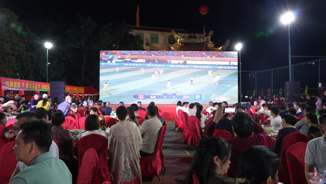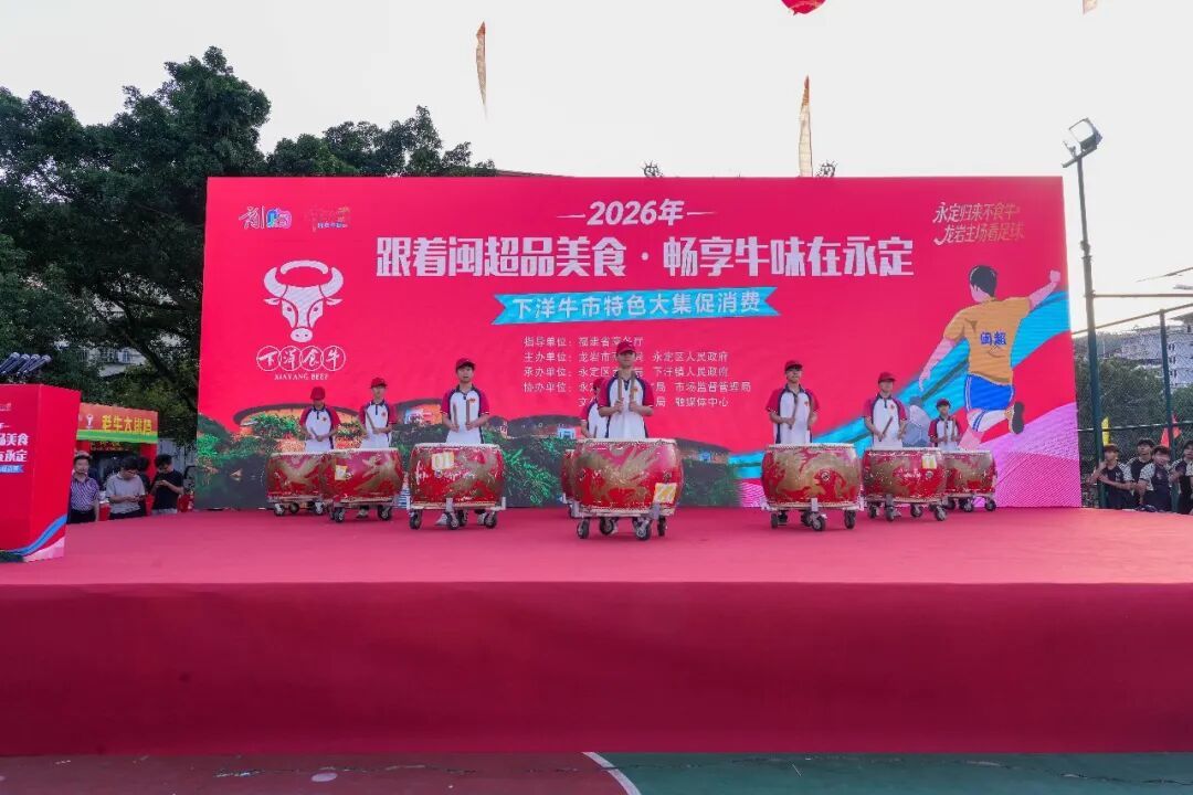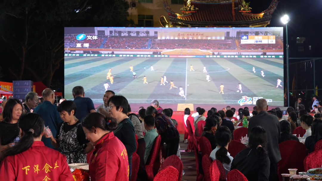 连日来,2026年福建省城市足球超级联赛激战正酣。4月25日晚,龙岩代表队驰骋闽超赛场,牵动着广大球迷的心。在永定区下洋镇老年活动中心广场,“全闽乐购——看闽超燃激情・畅享牛味在永定”下洋牛市特色大集火热开集,大屏同步直播赛事盛况,广大干部群众、侨乡乡亲、足球爱好者齐聚一堂,现场呐喊助威声势浩大,以客家侨乡独有的火热激情,为龙岩足球队征战闽超联赛强势加油鼓劲。