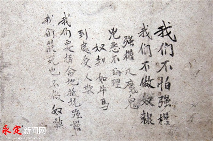 ![]() 永定暴动和红四军入闽 1928年6月,中共六大《政治决议案》指出“中国共产党现在争取群众,准备武装起义,以推翻地主豪绅资产阶级政权”为“十大政纲”的主要口号,肯定了“八七”会议上毛泽东提出的“枪杆子里出政权”的著名论断。 1926年夏月,湖雷上南村阮山受广东区委指派,从厦门回到永定,与虎岗乡的林心尧和湖雷石城坑赖秋实、赖玉珊(毛泽东在农民运动讲习所时的学生)等人一起组建了福建省第一个农村党支部——中共永定支部,阮山担任支部书记。1927年,阮山等人转入地下斗争。同年10月,阮山与罗秋天、张鼎丞、卢肇西等组织成立了中共永定县委,统一领导全县的革命斗争,深入发动群众,准备举行武装暴动。按照县委部署,1928年6月29日,阮山率领农民武装首先在上湖雷(包括上北横岗头和上南流坑岗)举行武装暴动,打响了“永定暴动”第一枪,以引诱永定城内的守敌出来,确保攻城的胜利。7月1日张鼎丞趁机率领金砂、西溪、东溪等地数千暴动队员举行溪南暴动,暴动队伍浩浩荡荡向县城进发,经过激烈战斗,攻下了永定县城。 1929年5月,毛泽东、朱德领导的红四军第二次入闽,解放了永定。在湖雷召开的赤卫队和地方干部会议上,毛泽东亲自宣布成立湖雷区革命委员会,推举阮山任主席。随后,毛泽东等人又于8月第二次来永定,驻在金丰大山,一边养病,一边指导革命斗争。在此期间,阮山多次与毛泽东亲切交谈,汇报情况,请示工作。10月下旬,永定县大部分地区已经解放,第一次全县工农兵代表大会在湖雷庆兴寺召开,阮山当选为永定县苏维埃政府主席,领导全县人民进行土地革命、武装斗争和经济文化建设,取得了很大成绩。 广和楼的红军标语 2017年11月上旬,笔者引导永定区博物馆的工作人员和专业摄像师,前往湖雷镇就近的几座土楼,察看和拍摄了当年红军遗留下来的红色标语。 广和楼,地处湖雷镇湖瑶村(当地称“湖洋寨”)的中心地带。湖雷革命前辈赖祖烈的女儿赖庆来在《毛主席与他的大管家赖祖烈》一文中写道:“赖祖烈第一次见到毛主席,就是在红四军第二次入闽的时候。那是1929年5月,毛主席、朱总司令率领的红四军第二次来到闽西永定县的湖雷。毛主席来到湖雷,就住在湖洋寨一个原来是商人赖阳书的房子里。赖祖烈回忆当时的情形时说:‘毛主席来到湖洋寨的当天晚上,就在驻地召开了永定县的党员干部会。就在这个会上,我第一次见到了日夜思念的毛主席……’”赖阳书的房子就是广和楼。广和楼后堂三楼的厅堂和房间的墙壁上留下许多墨写的标语: 努力学习马克斯列宁主义 实行土地革命 武装拥护苏联 打倒帝国主义的走狗国民党 打土豪分田地 消灭锺绍奎全部 红军十二军卅四师一〇〇团 这里的“红军十二军”,应是1930年5月闽西特委根据中央指示,将成立不久的红九军改称为红十二军(军长邓毅刚,政治委员邓子恢,参谋长郑益,政治部主任陈正)。原辖的5个团扩编为3个纵队,全军3000余人。两个月后,红十二军编入红一军团。 锺绍奎(葵),1901年出生,武平县岩前镇龙井村人。1932年,他投靠广东军阀陈济棠,被改编为国民革命军第三军新编独立第一旅,锺绍奎任旅长,成为割据闽西的主要势力。 怀德楼的红军标语 1931年,罗陂村是永定县苏维埃政府机关和红军后方医院所在地。罗陂村的怀德楼,里里外外有许多字迹清晰的标语,如“国民党是洋奴恶棍、军阀官僚、土豪劣绅的集合场”、“国民政府是刮民政府”、“蒋桂战争是国民党政权崩溃的开始”、“统一中国,承认汉满蒙回藏各民族的自决权”、“枪毙压迫福建人民的卢新铭”、“欢迎刘和鼎部下的军官士兵到红军里来当官兵”、“红军来了,白军不得了”、“穷人不打穷人”以及“国民党是反革命,保护土豪和劣绅,受痛苦工农士兵;国民革命四十年,天天打仗争地盘,不共产怎得安全……如今世界大造反,无产阶级要共产,俄罗斯有好榜样;共同消费共生产,不纳租税不完粮,这就是共产主张……”的《新四川调》等。 福申楼的红军标语 福申楼,地处湖雷镇石坑村(距红九团团长吴胜故居50米)。此楼为吴恒焕进士(清朝乾隆40年)外出湖南的后裔于清朝末年所建,但从未入住。土地革命时期,红军作为活动据点,在墙上留下许多标语。红军撤离后被当时国民党政府征为粮食仓库使用。 这些标语内容有“我们不怕强权,我们不做奴隶。强权是魔鬼,凶恶不讲理。奴隶如牛马,到处受人欺。我们要拼命地抵抗强权,我们能(宁)死也不做奴隶。” “工农兵暴动起来打倒土豪劣绅的走狗国民党。” 在石坑村的“居安楼”楼外白壁上还有红色标语赫然在目。 红军标语的产生和宣传作用 早在1929年4月17日,红军第四军政治部在江西于都发布了书写《红军标语》的“注意事项”。 陈毅在《在关于红军的宣传工作》(1929年9月)中提出:“红军现在有一个宣传兵制度,凡军队每一个机关(如连部、营部或政治部、卫生队等)均须派五个人担任宣传工作,这五个人不背枪,不服勤务,名叫宣传兵。此五人分两组,一组为演讲队,担任口头宣传,凡红军所到的地方,行军时经过的乡村酒店茶店,或大市镇均须手持红旗及标语传单向群众宣传,到了城市便须全体出发,大街小巷或商店作个别宣传或挨户宣传。半日的时间必须召集一个群众大会,群众为了懂得红军这个怪物及朱毛的容仪,常常是普通的跑来参加这个