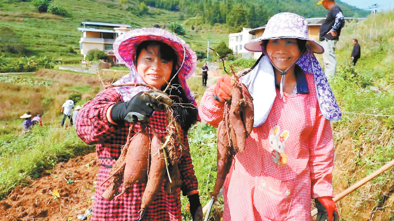田间收获忙 ■通讯员 黄秋萍 陈景彬 文/图 日前,笔者走进龙岩市永定区陈东乡岩太村紫薯基地看到,村民们正挥舞着锄头采挖紫薯,只见一垄垄表皮鲜红、形态修长的紫薯破土而出,个个体态饱满,颜色鲜亮,村民们正熟练地去泥、挑拣、装袋,每个人的脸上都洋溢着丰收的喜悦,一派繁忙丰收的画卷正徐徐展开。 “今年我们在这边种了800来亩的紫薯,每亩的产量在5000斤左右,今年紫薯的品质跟产量都很不错,可以给我们带来400来万的产值。”陈东乡岩太村紫薯种植基地负责人吴俊财说道。 吴俊财告诉记者,紫薯是短平快高效农业,也是劳动密集型产业,从育苗、栽种、田间管理到采收、分等、销售等每个环节都需要大量劳动力,每年带动8000余人次就业增收。紫红的紫薯不但增加了村民的收入,也火红了村民的日子,当地依靠红辣椒、紫薯大面积种植,越来越多的人吃上了“产业饭”。 近年来,永定区陈东乡岩太村党支部推行支部领办合作社,“零”租金流转农民荒地1000余亩,农户以土地入股,以“分红+务工”的方式进行收益。通过复垦规模化发展辣椒、紫薯种植业,使用有机肥种地养地,实施辣椒、紫薯、水稻水旱轮作,让耕地相互交叉补充养分,避免耕地“非粮化”“非农化”。以党支部领办合作社的形式,通过合理开发利用农业、文化、旅游资源,岩太村走出“以农促旅、以文兴旅、以旅兴农”的发展之路。 |
